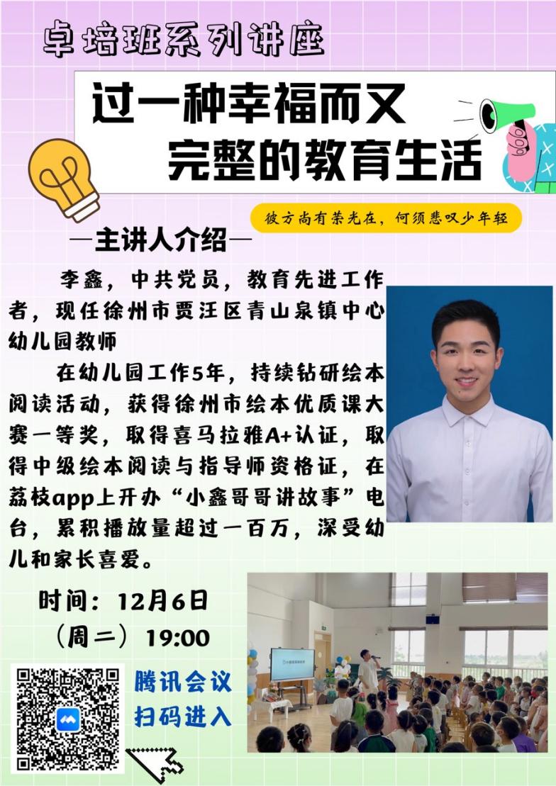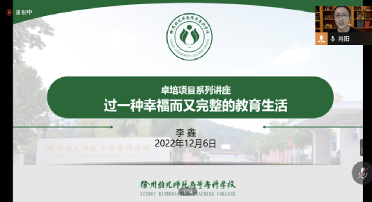 12月6日晚, 2018届优秀毕业生李鑫,受邀以《过一种幸福而又完整的教育生活》为题,为我院2021级、2022级卓培项目组同学开设专业成长讲座,交流成长经验。