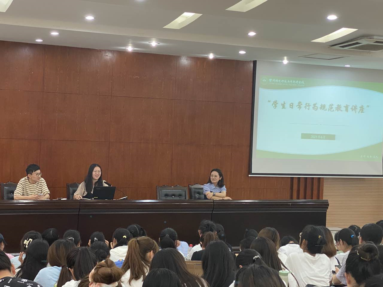 6月10日下午,我院在碧螺校区学术报告厅举办三年制学生行为习惯养成教育讲座。学院辅导员王巧巧、范继瑶和毕业生代表刘霜共同为学院两百余名学生作讲座。