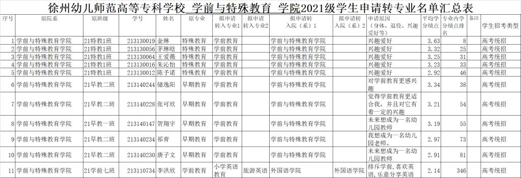 我院根据《普通高等学校学生管理规定》(教育部令第41号)、《教育部关于做好2014年普通高校招生工作的通知》(教学〔2014〕1号)、《省教育厅关于进一步加强和规范普通高等学校学生转专业工作管理的通知》(苏教学〔2014〕8号)、《省教育厅关于加强普通高等学校学生转专业工作管理的指导意见》苏教学〔2010〕20号等文件的精神,按照《304am永利集团学生转专业管理办法》(徐幼专教〔2022〕1号)有关规定,经学生本人申请、转专业工作领导小组审核,同意以下11位学生转出申请,现予以公示。