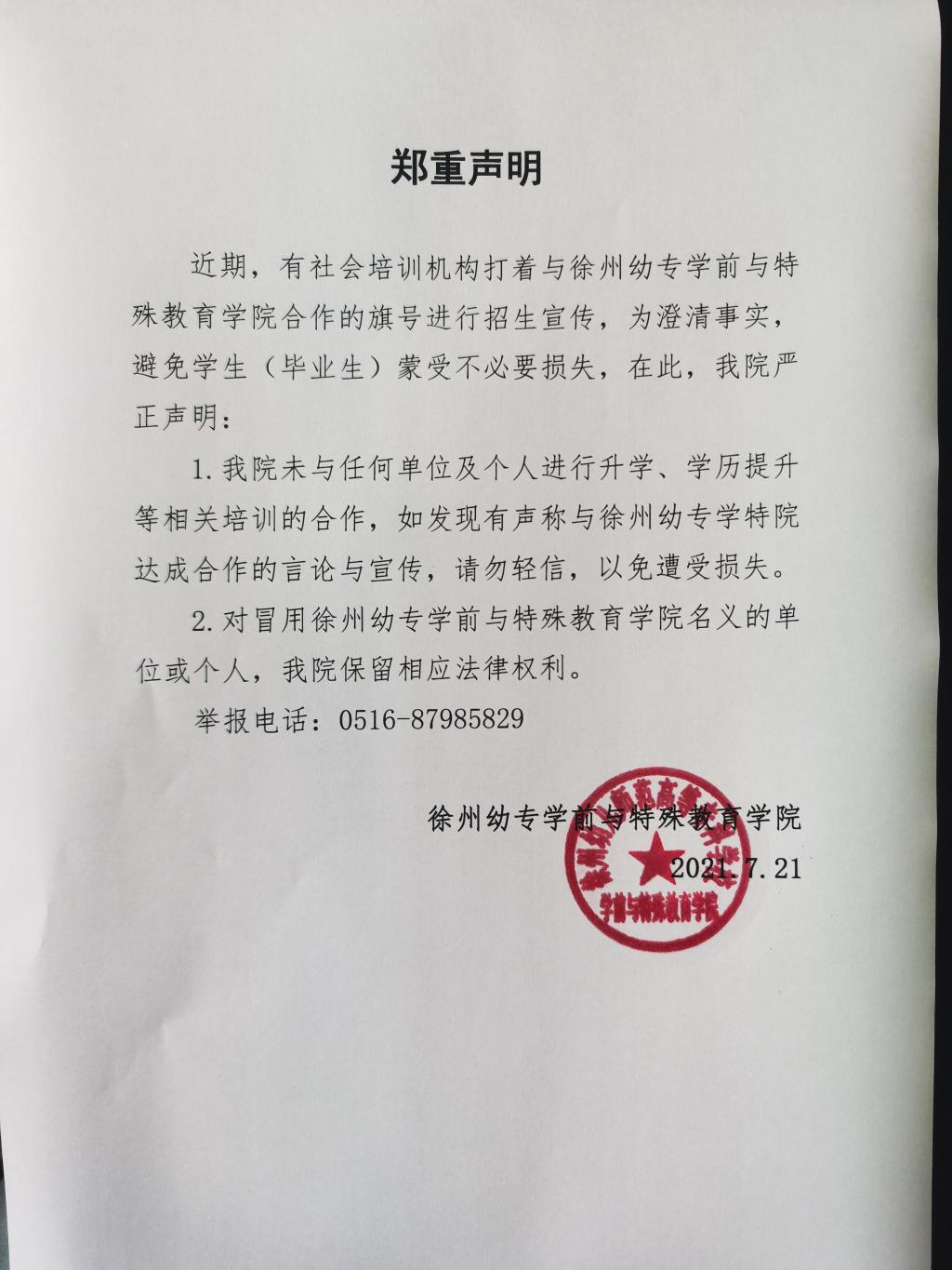 1.我院未与任何单位及个人进行升学、学历提升等相关培训的合作,如发现有声称与徐州幼专学特院达成合作的言论与宣传,请勿轻信,以免遭受损失。