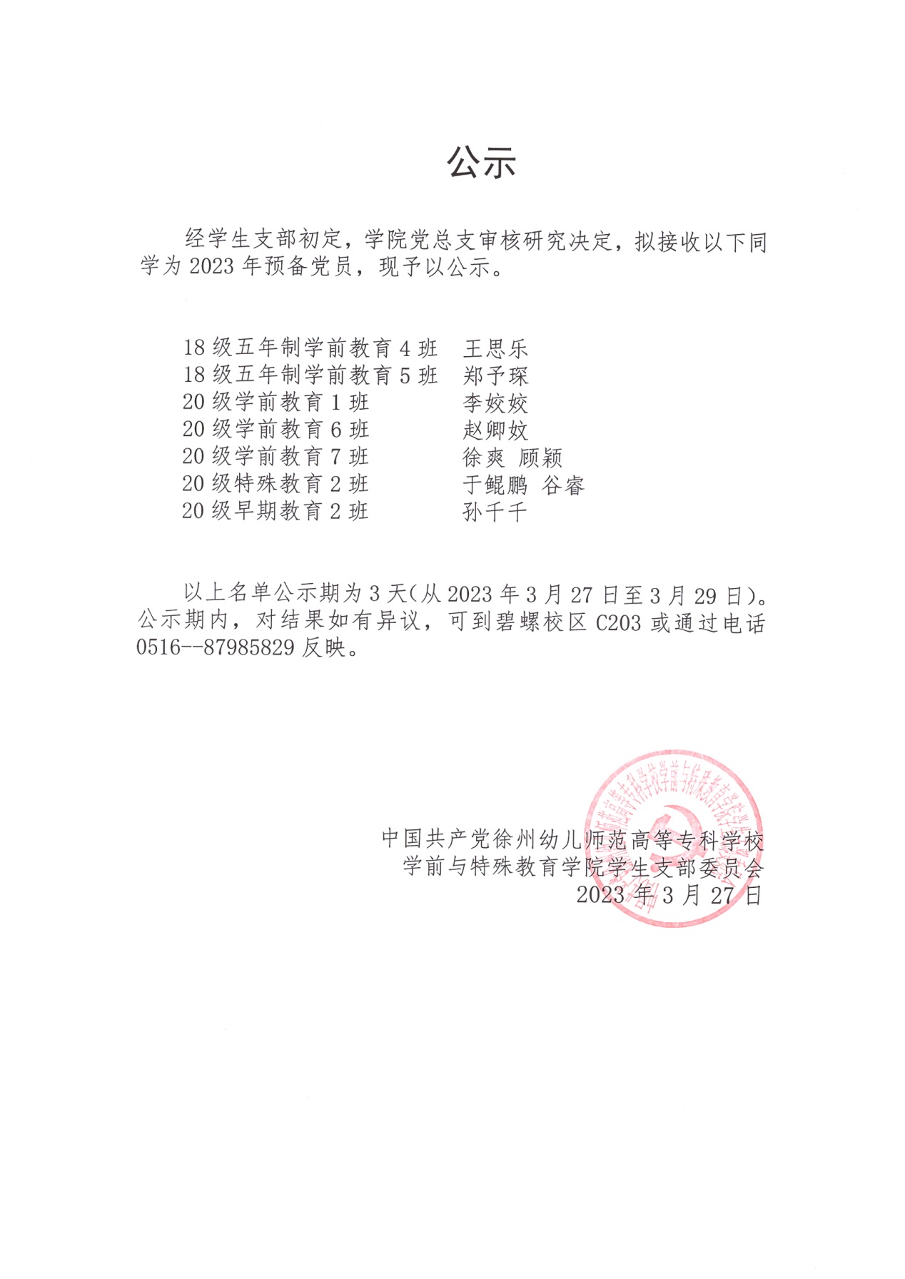 拟确定预备党员公示