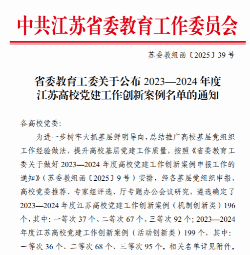 近日,江苏省委教育工委公布了2023—2024年度江苏高校党建工作创新案例评选结果。我院学生党支部“构建‘红柚五维’育人体系,传承红色精神血脉”入选党建活动创新案例。