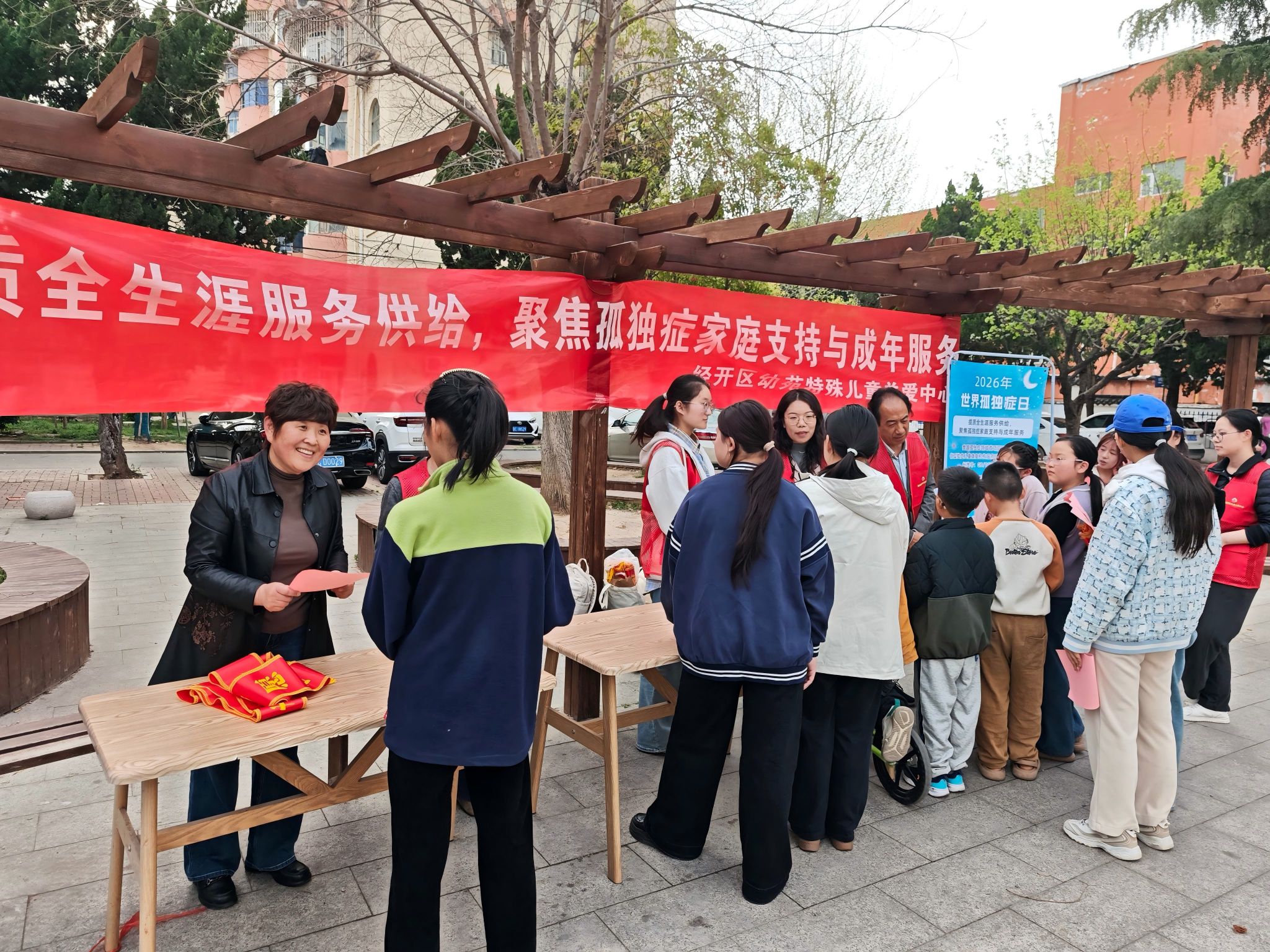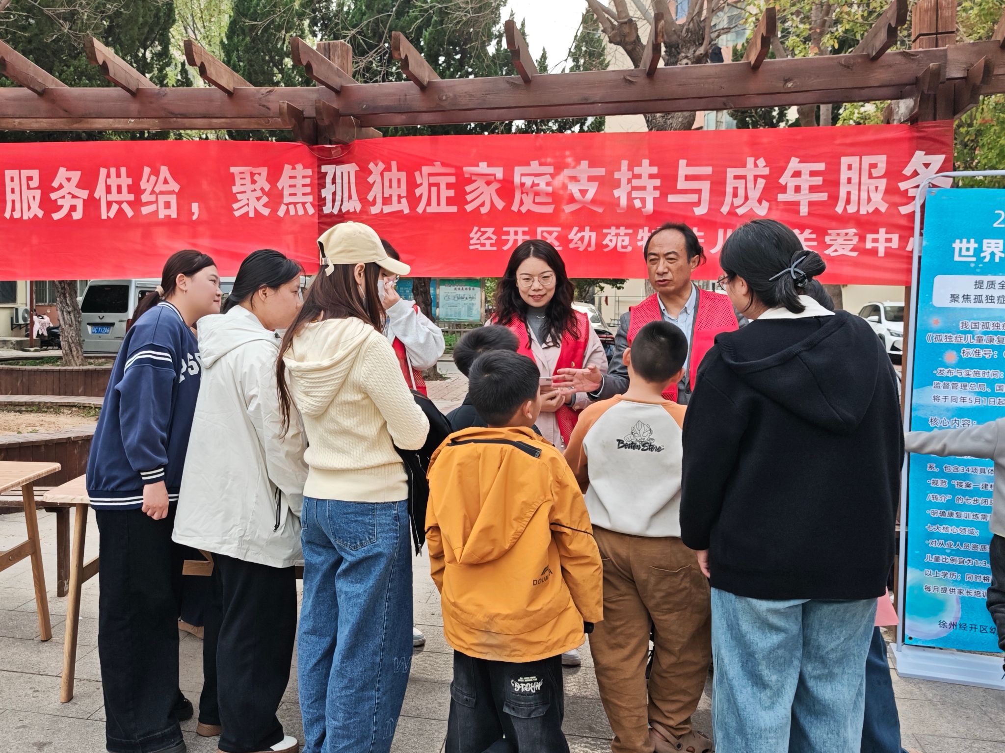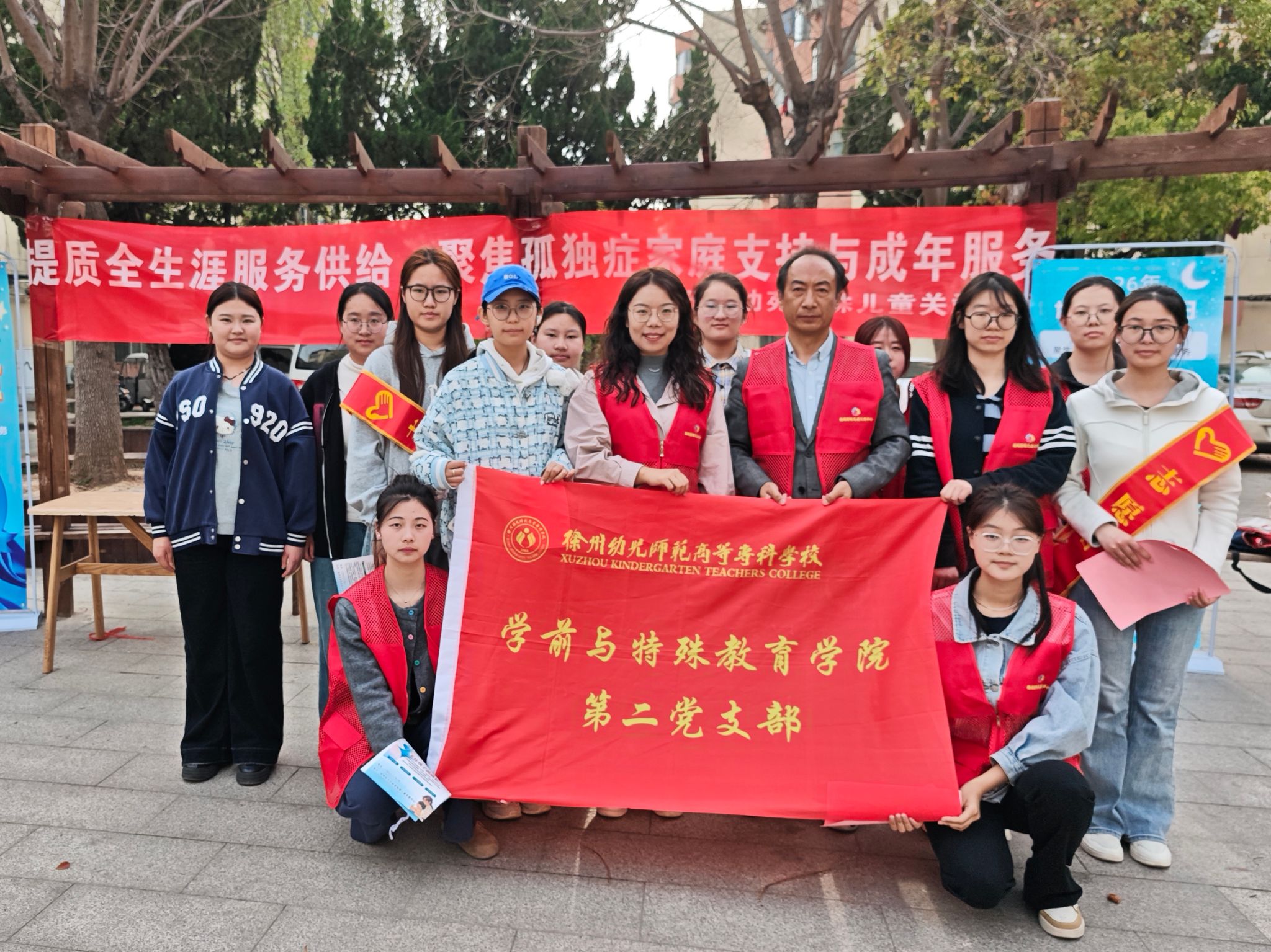 支部党员教师、关爱中心康复师及特教专业学生代表还组成志愿服务队,联合徐州经开区金苑社区,在社区广场开展了孤独症科普宣教活动。通过发放宣传单页、现场答疑、互动游戏等方式,向居民普及孤独症早期识别信号和科学干预方法,纠正“孤独症就是性格内向”等常见误区。金苑社区工作人员积极参与组织协调,双方共同搭建起家门口的“科普课堂”。