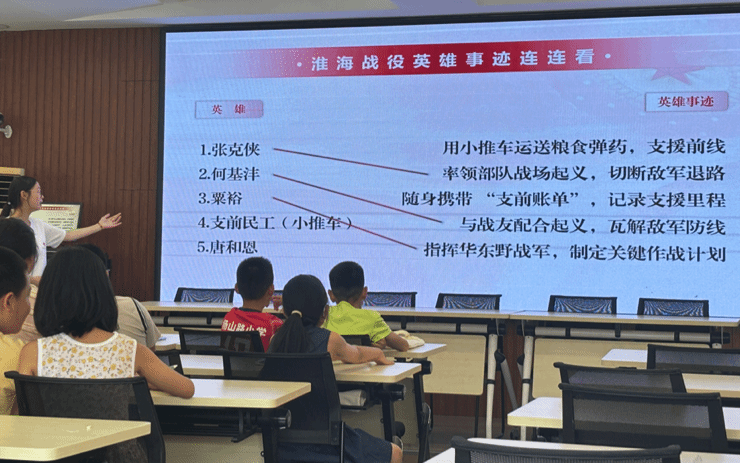 志愿者们借助历史影像资料,向孩子们再现淮海战役激烈的战斗场景;“淮海英雄连连看”互动环节,通过匹配英雄姓名与事迹,帮助孩子们深化对英雄精神和历史事实的理解,让红色的种子在童心中生根发芽。